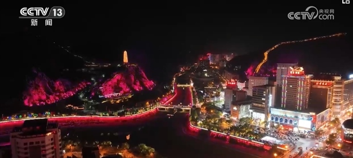 隨著夜幕降臨,寶塔山化身為一幅巨大的畫布,上演著音樂燈光秀。聲光合一、三山聯(lián)動(dòng),360度環(huán)繞演繹,生動(dòng)展現(xiàn)了延安的紅色故事和文化特色。