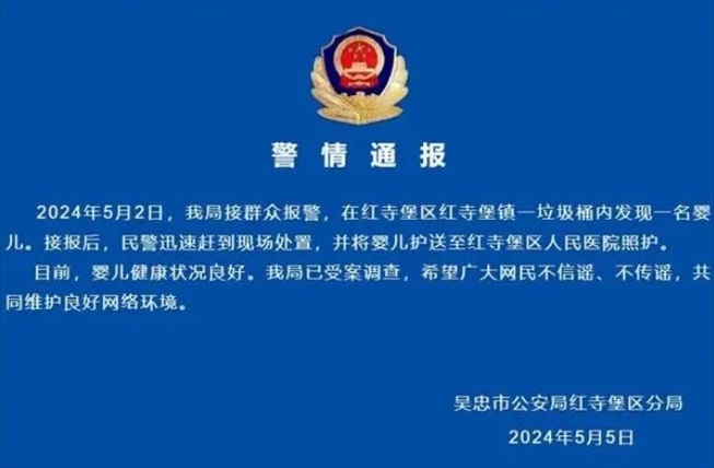 ·寧夏吳忠一垃圾桶內(nèi)發(fā)現(xiàn)棄嬰,警方通報(bào):已受案調(diào)查。