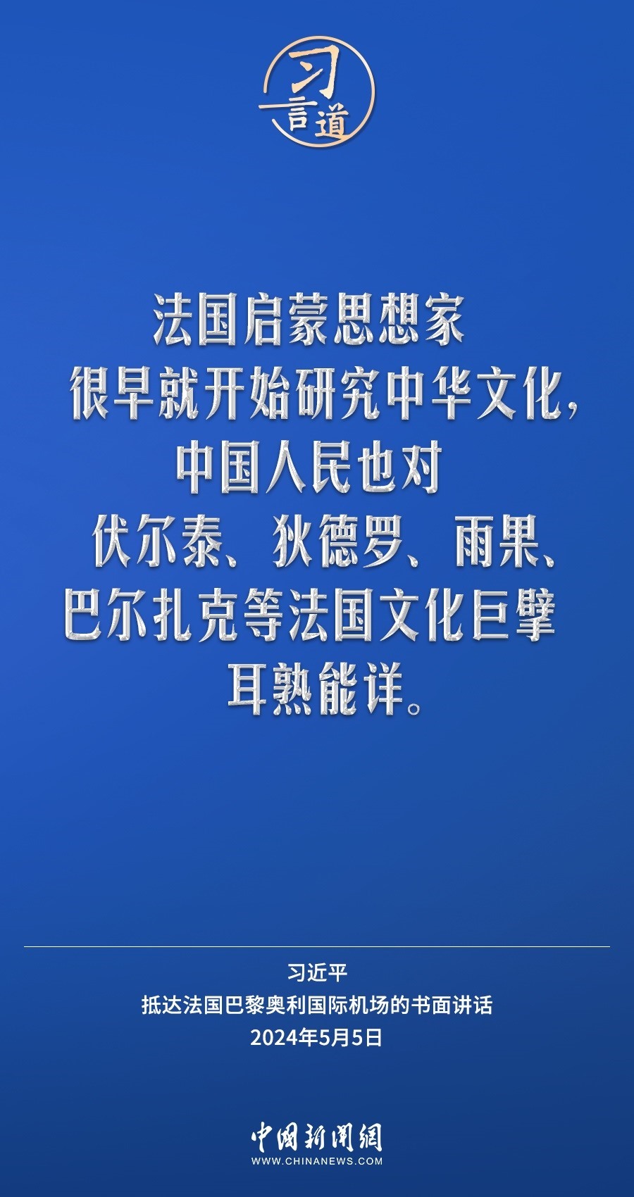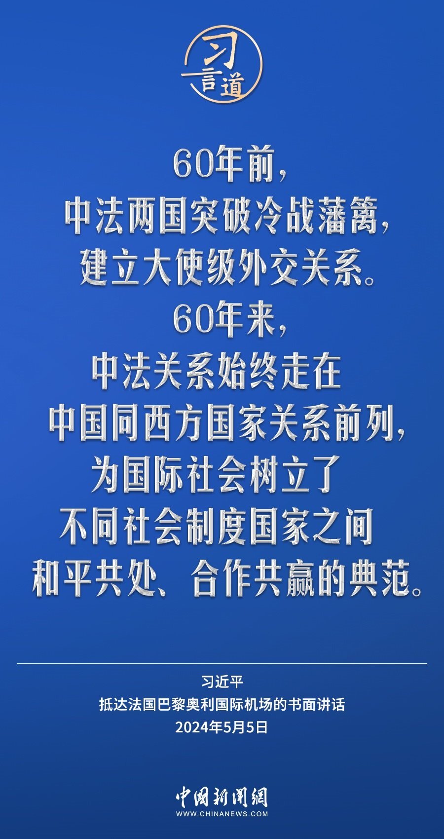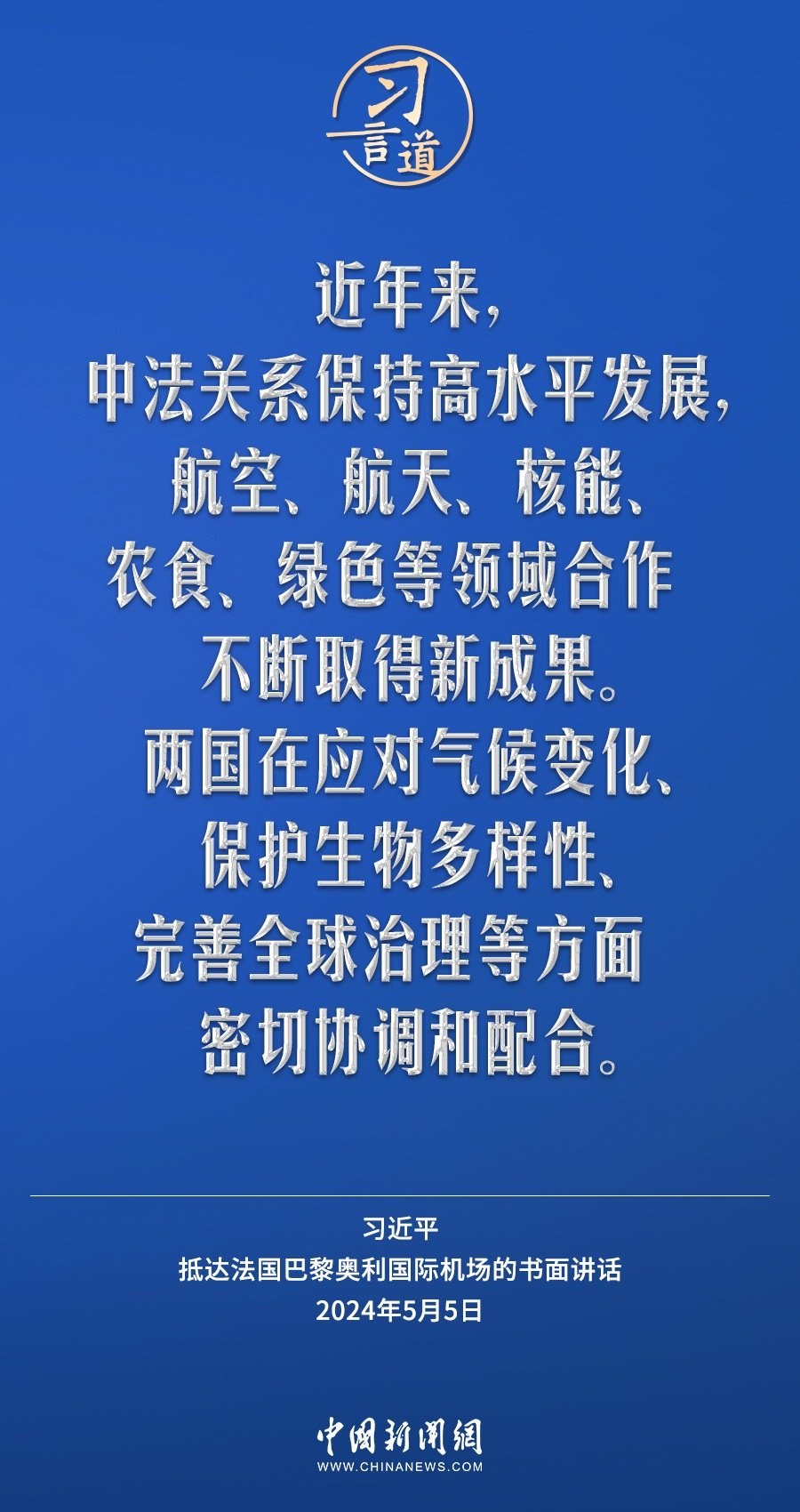 當(dāng)?shù)貢r(shí)間5月5日下午,國家主席習(xí)近平抵達(dá)巴黎,開始對法國進(jìn)行國事訪問。在抵達(dá)法國巴黎奧利國際機(jī)場的書面講話中,習(xí)近平指出——