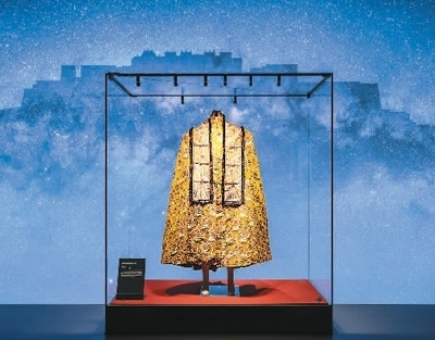 走進(jìn)展廳,在星空璀璨的布達(dá)拉宮夜景映襯下,一件金燦燦的斗篷格外引人注目。斗篷是西藏地區(qū)常見(jiàn)的服裝,根據(jù)場(chǎng)合和穿著對(duì)象的不同,斗篷的式樣和用料均有所差別。這件金寶地花卉紋斗篷通長(zhǎng)170厘米,黃綢緞上繡滿(mǎn)了花紋圖案,并鑲有多種珠寶,衣領(lǐng)上縫有獺皮,背后繡有云龍紋,可想而知穿著者身份之顯赫。此次展覽是它首次公開(kāi)展出。