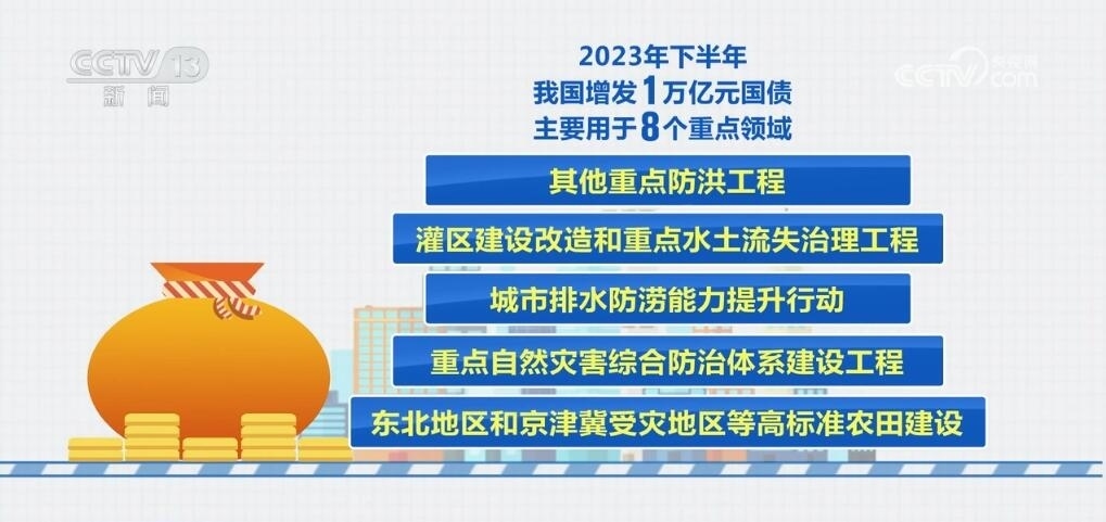 去年下半年,我國增發(fā)了1萬億元國債,主要用于8個重點(diǎn)領(lǐng)域,包括:災(zāi)后恢復(fù)重建,支持以京津冀為重點(diǎn)的華北地區(qū)等災(zāi)后恢復(fù)重建和提升防災(zāi)減災(zāi)能力,促進(jìn)災(zāi)區(qū)基本生產(chǎn)生活條件和經(jīng)濟(jì)發(fā)展恢復(fù)到災(zāi)前的水平;以海河、松花江流域等北方地區(qū)為重點(diǎn)的骨干防洪治理工程;自然災(zāi)害應(yīng)急能力提升工程;其他重點(diǎn)防洪工程;灌區(qū)建設(shè)改造和重點(diǎn)水土流失治理工程;城市排水防澇能力提升行動;重點(diǎn)自然災(zāi)害綜合防治體系建設(shè)工程;東北地區(qū)和京津冀受災(zāi)地區(qū)等高標(biāo)準(zhǔn)農(nóng)田建設(shè)。