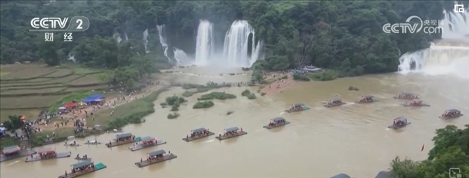 水量大增的瀑布奔騰而下沖擊著河面水聲轟鳴,慕名前來的游客們或乘坐竹筏感受瀑布的恢弘氣勢(shì),或?qū)ふ易罴褭C(jī)位與瀑布“打卡”合影。除了近距離觀賞德天跨國瀑布,也有不少游客選擇跨境游玩,站在越南境內(nèi)的板約瀑布看德天瀑布,以不同視角體驗(yàn)中越風(fēng)情。