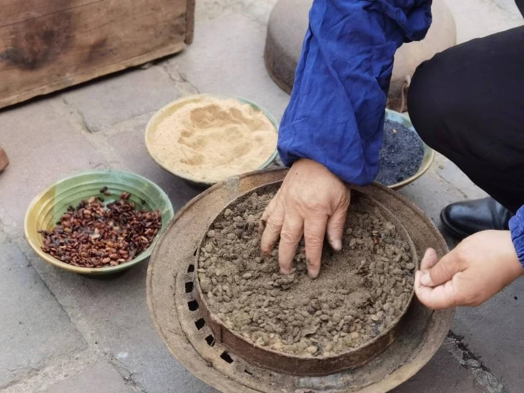 沖好針孔,便在磨石上反復(fù)銼尖。隨后倒入熱鍋里翻炒,再舀入一瓢水,針的剛性和硬度由此增加。接下來便輪到三大碗“大陽秘方”登場:白崖土粉末、松木炭和發(fā)酵后的豆豉,用于蒸針?!八赡咎靠梢栽黾愉撫樀暮剂浚嵘捕?;豆豉增加亮度;白崖土粉末作為分散劑讓針受熱均勻。這樣處理后可以保證針質(zhì)更堅硬又有光澤。”