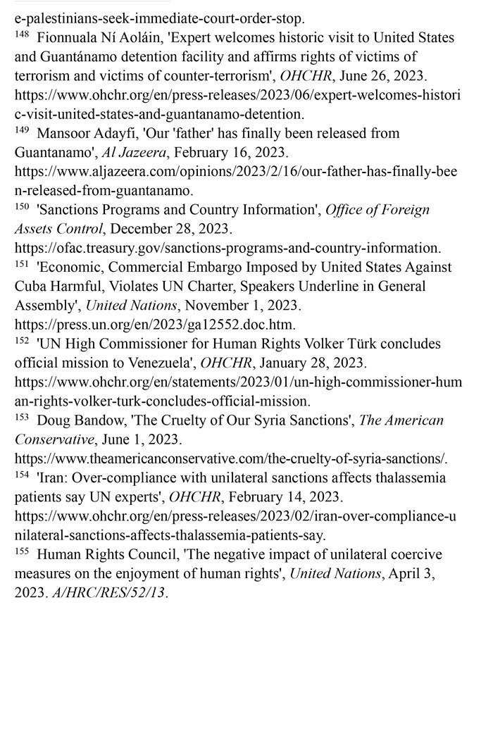 長期濫施單邊制裁造成嚴(yán)重人道主義后果。自1950年以來,美國使用的制裁次數(shù)居全球之首。根據(jù)美國財(cái)政部2023年12月28日公布的數(shù)據(jù),美國制裁的國家超過20個(gè)。(注150)第78屆聯(lián)合國大會(huì)發(fā)言人2023年11月1日指出,美國對古巴實(shí)施的經(jīng)濟(jì)、商業(yè)和金融封鎖違反了《聯(lián)合國憲章》,對古巴人民造成了毀滅性影響。(注151)聯(lián)合國大會(huì)2023年11月2日通過決議,再次敦促美國終止對古巴長達(dá)60多年的經(jīng)濟(jì)、商業(yè)和金融封鎖,這是聯(lián)合國大會(huì)連續(xù)第31年通過類似決議。2023年1月28日,聯(lián)合國人權(quán)事務(wù)高級專員沃爾克·圖爾克在訪問委內(nèi)瑞拉后表示,2017年以來美國施加的制裁加劇了委內(nèi)瑞拉的經(jīng)濟(jì)危機(jī),嚴(yán)重阻礙人權(quán)的實(shí)現(xiàn)。(注152)“美國保守派”網(wǎng)站2023年6月1日報(bào)道,美國制裁進(jìn)一步加劇了敘利亞人民的貧困。敘利亞70%的人口面臨食物短缺,其中1200萬人三餐不繼,290萬人食不果腹。(注153)聯(lián)合國人權(quán)理事會(huì)單邊強(qiáng)制措施對人權(quán)負(fù)面影響問題特別報(bào)告員阿萊娜·杜晗2023年2月14日指出,美國對伊朗的制裁減少了地中海貧血癥患者從國外進(jìn)口救命藥物的機(jī)會(huì),導(dǎo)致伊朗患者的并發(fā)癥和死亡率增加,是對健康權(quán)的侵犯。(注154)聯(lián)合國人權(quán)理事會(huì)2023年4月3日通過決議指出,單邊強(qiáng)制性措施會(huì)對目標(biāo)國家廣大民眾的人權(quán)產(chǎn)生深遠(yuǎn)影響,對窮人和處境最脆弱的人影響尤為嚴(yán)重。決議譴責(zé)某些大國繼續(xù)單方面適用單邊強(qiáng)制性措施。美國在該決議表決中投了反對票。(注155)