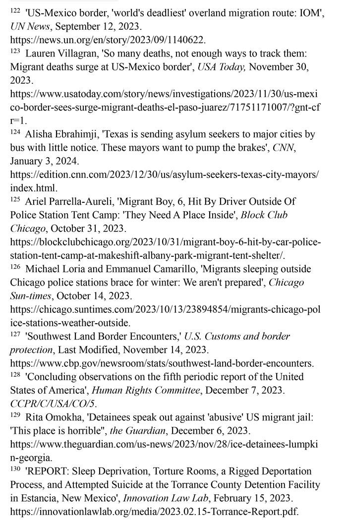 入境移民遭受酷刑及其他不人道待遇。2023財(cái)年,在美國南部邊境遭逮捕或驅(qū)逐的移民總數(shù)達(dá)240多萬人,再創(chuàng)歷史新高。(注127)聯(lián)合國人權(quán)事務(wù)委員會(huì)對移民在美國受到長時(shí)間的拘留表示擔(dān)憂,批評美國的拘留所條件惡劣,人滿為患,被拘押者無法獲得食物、水和醫(yī)療服務(wù),導(dǎo)致包括兒童在內(nèi)的許多人死亡;公共和私營移民拘留設(shè)施存在性暴力、長期單獨(dú)監(jiān)禁、虐待等侵犯人權(quán)問題。(注128)英國《衛(wèi)報(bào)》網(wǎng)站2023年12月6日報(bào)道,由美國私人監(jiān)獄公司CoreCivic運(yùn)營的、位于佐治亞州蘭普金的斯圖爾特拘留中心存在長期單獨(dú)監(jiān)禁、性虐待、醫(yī)療疏忽以及強(qiáng)迫勞動(dòng)等令人擔(dān)憂的問題。(注129)創(chuàng)新法律實(shí)驗(yàn)室于2023年2月15日發(fā)布報(bào)告揭露,由CoreCivic運(yùn)營的、位于新墨西哥州埃斯坦西亞的托蘭斯縣拘留所存在對被關(guān)押者實(shí)施酷刑現(xiàn)象。在夜間,每隔15分鐘就會(huì)有一名警衛(wèi)開著收音機(jī)的最大音量走過這些房間,大聲地敲著門,并用手電筒強(qiáng)光照進(jìn)房間,吵醒任何可能睡著的人。在寒冷的天氣里,每個(gè)房間的通風(fēng)管道整夜都在吹冷空氣。一些人試圖用衛(wèi)生紙或毯子蓋住通風(fēng)口,但警衛(wèi)們拿走了用來阻擋冷空氣的任何東西。這些牢房里,廁所污水和糞便溢出,人們被迫睡在臭氣熏天的地板上。(注130)