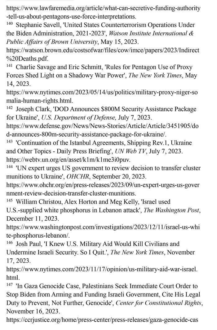 持續(xù)向沖突地區(qū)提供武器。美國國防部2023年7月7日發(fā)布的新聞稿顯示,美國向?yàn)蹩颂m提供的價(jià)值8億美元的額外軍事援助中,包含大量集束彈藥。(注142)聯(lián)合國秘書長副發(fā)言人哈克2023年7月7日回答記者提問時(shí)表示,聯(lián)合國秘書長安東尼奧·古特雷斯希望各國遵守《集束彈藥公約》,不要在戰(zhàn)場上繼續(xù)使用集束彈藥。(注143)聯(lián)合國人權(quán)高專辦網(wǎng)站2023年9月20日報(bào)道,聯(lián)合國人權(quán)理事會(huì)酷刑和其他殘忍、不人道或有辱人格的待遇或處罰問題特別報(bào)告員愛麗絲·吉爾·愛德華茲2023年7月向美國政府發(fā)出緊急信函,警告集束彈藥會(huì)對平民造成嚴(yán)重傷害。(注144)《華盛頓郵報(bào)》網(wǎng)站2023年12月11日報(bào)道,美國每年流入以色列的軍火達(dá)數(shù)十億美元,以色列在10月對黎巴嫩南部的一次襲擊中使用了美國供應(yīng)的白磷彈藥,造成至少9名平民受傷。(注145)美國國務(wù)院政治軍事事務(wù)局前局長喬?!けA_2023年10月18日在《紐約時(shí)報(bào)》網(wǎng)站發(fā)表專欄文章指出,美國每年向以色列提供至少38億美元軍事援助,加沙地帶最嚴(yán)重的人員傷亡大多是由美國提供的彈藥所導(dǎo)致,譴責(zé)這種軍事援助無視人權(quán)問題。(注146)美國人權(quán)組織“憲法權(quán)利中心”2023年11月16日報(bào)道,滅絕種族與死刑問題專家威廉·沙巴斯指責(zé)美國未能履行防止種族滅絕的法律義務(wù),違反了習(xí)慣國際法和《防止及懲治滅絕種族罪公約》。(注147)