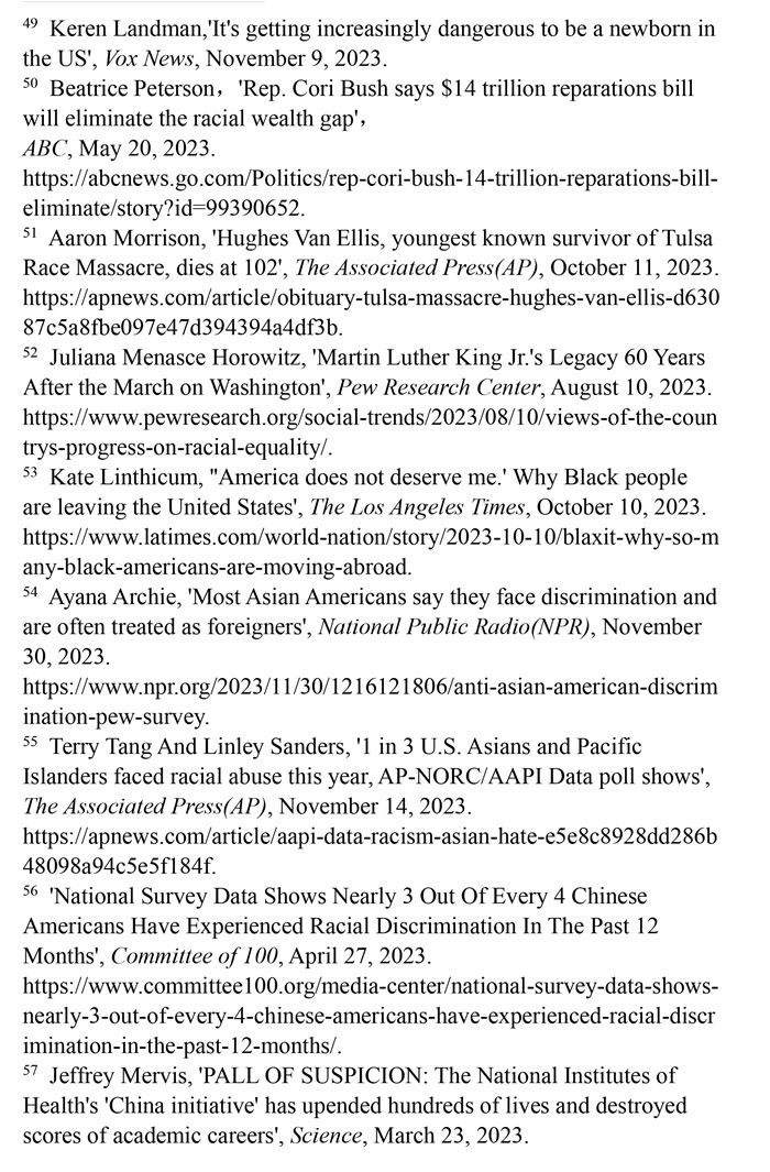 對華裔科學(xué)家的迫害仍在持續(xù)。雖然美國政府針對華裔科學(xué)家的“中國行動(dòng)計(jì)劃”被暫停,但該計(jì)劃帶來的深遠(yuǎn)影響?yīng)q在,眾多華裔科學(xué)家仍然有強(qiáng)烈的不安全感。美國《科學(xué)》雜志2023年3月23日刊發(fā)文章,講述了“中國行動(dòng)計(jì)劃”對華裔科學(xué)家的迫害。在被美國國立衛(wèi)生研究院調(diào)查的246人中,103人失去工作,超過五分之一的人被禁止在4年內(nèi)申請國立衛(wèi)生研究院資助,給他們的學(xué)術(shù)生涯帶來重大打擊。這246人中有81%的科學(xué)家是亞裔。(注57)普林斯頓大學(xué)、哈佛大學(xué)和麻省理工學(xué)院對近1400名在美國大學(xué)擔(dān)任終身教職的華裔美國人的調(diào)查顯示,72%的人表示沒有安全感,42%的人害怕在美國開展研究。(注58)