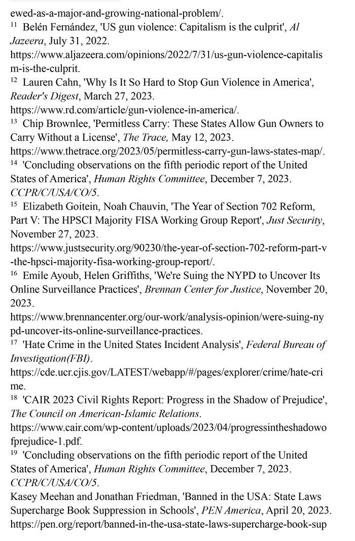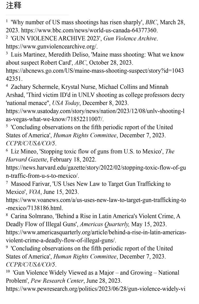 槍支暴力造成慘痛生命代價(jià)。數(shù)據(jù)顯示,美國所有類型的槍支暴力事件都呈上升趨勢。(注1)根據(jù)“槍支暴力檔案”網(wǎng)站統(tǒng)計(jì)的數(shù)據(jù),2023年美國至少發(fā)生了654起大規(guī)模槍擊事件。槍支暴力導(dǎo)致近4.3萬人死亡,平均每天死亡117人。(注2)例如,美國廣播公司新聞網(wǎng)站2023年10月28日報(bào)道,緬因州發(fā)生大規(guī)模槍擊事件,造成至少18人死亡,13人受傷。(注3)《今日美國報(bào)》網(wǎng)站2023年12月6日報(bào)道,拉斯維加斯3名大學(xué)教授被一名前同事槍殺。美國大學(xué)教授協(xié)會(huì)主席艾琳·馬爾維稱,槍支暴力是“不可接受的國家威脅”,敦促美國政府進(jìn)行槍支政策改革。(注4)美國與槍支有關(guān)的傷亡人數(shù)激增,引發(fā)聯(lián)合國人權(quán)事務(wù)委員會(huì)的嚴(yán)重關(guān)切。(注5)