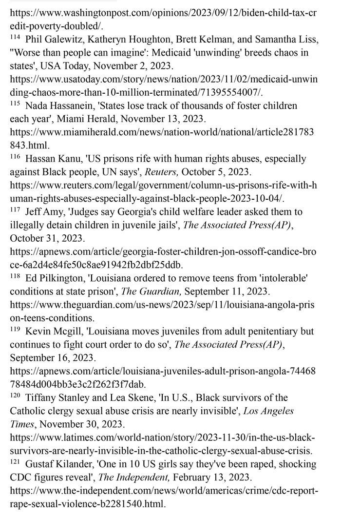 少年司法系統(tǒng)中的兒童遭受不人道待遇。2023年10月,聯(lián)合國人權(quán)理事會(huì)在執(zhí)法工作中推進(jìn)種族正義和平等的國際獨(dú)立專家機(jī)制調(diào)查顯示,美國刑事司法系統(tǒng)充斥著某些特有的不人道做法。美國是世界上唯一一個(gè)判處兒童終身監(jiān)禁不得假釋的國家。(注116)在佐治亞州,兒童福利機(jī)構(gòu)的負(fù)責(zé)人要求法官將有精神問題和行為問題的兒童拘留在少年監(jiān)獄。(注117)自2022年10月以來,多達(dá)80名兒童被帶到路易斯安那州以暴力著稱的安哥拉監(jiān)獄,關(guān)押在死刑犯等待處決的牢房里。(注118)盡管這些兒童與成年囚犯隔離,但他們遭受了危險(xiǎn)的熱浪,長時(shí)間被關(guān)在牢里,使用的是污水,更無法獲得教育。(注119)