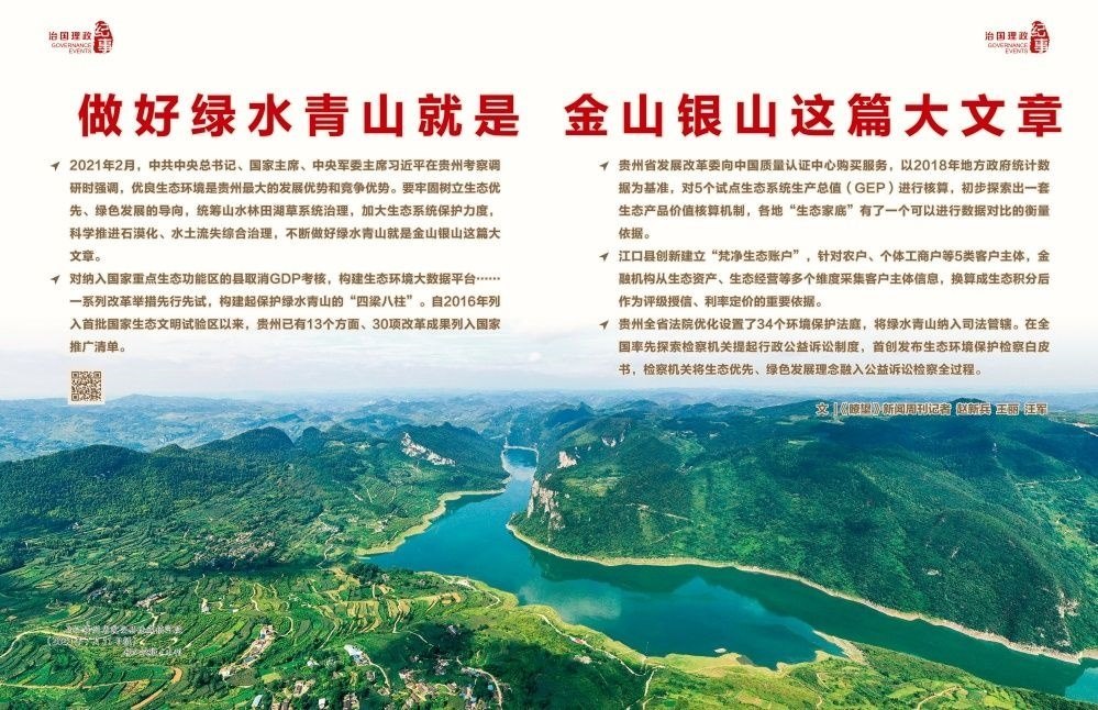 ◇2021年2月,中共中央總書記、國(guó)家主席、中央軍委主席習(xí)近平在貴州考察調(diào)研時(shí)強(qiáng)調(diào),優(yōu)良生態(tài)環(huán)境是貴州最大的發(fā)展優(yōu)勢(shì)和競(jìng)爭(zhēng)優(yōu)勢(shì)。要牢固樹(shù)立生態(tài)優(yōu)先、綠色發(fā)展的導(dǎo)向,統(tǒng)籌山水林田湖草系統(tǒng)治理,加大生態(tài)系統(tǒng)保護(hù)力度,科學(xué)推進(jìn)石漠化、水土流失綜合治理,不斷做好綠水青山就是金山銀山這篇大文章。