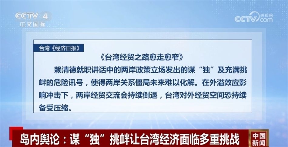 臺灣《經(jīng)濟(jì)日報》近日發(fā)表題為《臺灣經(jīng)貿(mào)之路愈走愈窄》的社論指出,賴清德就職講話中的兩岸政策立場發(fā)出的謀“獨”及充滿挑釁的危險訊號,使得兩岸關(guān)系僵局未來難以化解。在外溢效應(yīng)影響沖擊下,兩岸經(jīng)貿(mào)交流會持續(xù)倒退,臺灣對外經(jīng)貿(mào)空間恐持續(xù)備受壓縮。