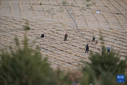 在其白線沙地綜合治理工程項目區(qū),記者跟隨治沙隊伍在松軟的沙丘上迎坡徒步前行,每走一步,退后半步,沙粒灌滿鞋履。然而,來自當?shù)氐闹紊橙罕妳s早已習(xí)慣,他們兩三人一組,配合默契,有人拉著稻草橫放鋪平,有人則用工具按壓培土,還有人跟在后面,在鋪好的草方格里撒下草籽?!白罡叻宓臅r候每天有上千人參與治沙,推進速度很快?!眲h(huán)宇介紹,今年以來全旗已完成26.5萬畝的治沙任務(wù)。