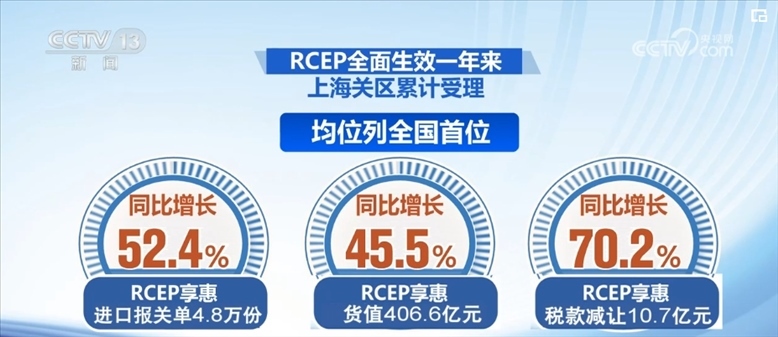 在上海,RCEP全面生效一年來,上海關(guān)區(qū)累計(jì)受理RCEP享惠進(jìn)口報(bào)關(guān)單4.8萬份,貨值406.6億元,稅款減讓10.7億元,均位列全國首位,同比分別增長(zhǎng)52.4%、45.5%和70.2%,
