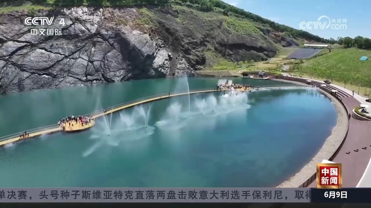 在黑龍江雙鴨山的翡翠湖礦坑公園,藍(lán)綠色湖水在陽(yáng)光照耀下如詩(shī)如畫,游客們身處山野間,感受著自然之美和夏日清涼。