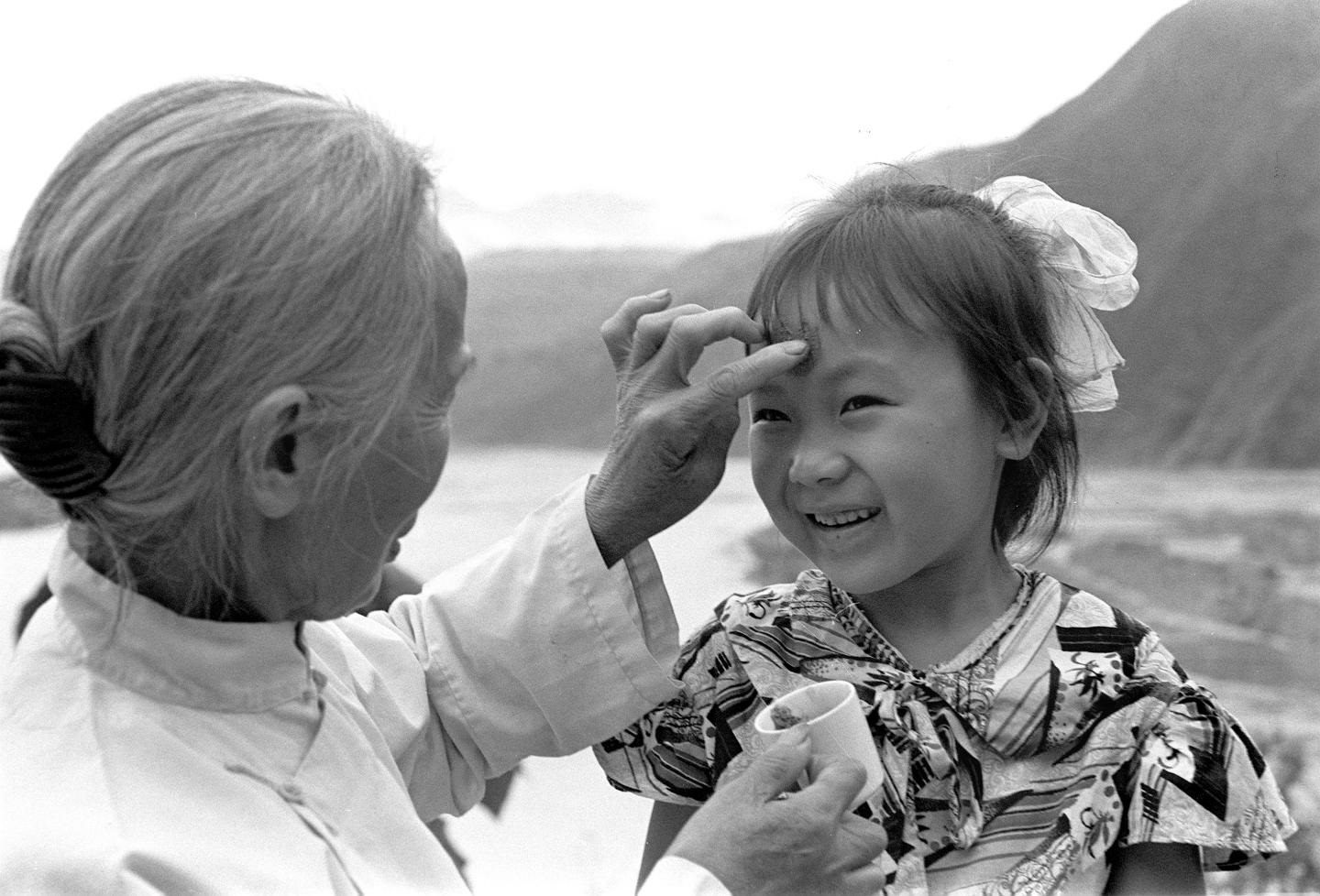 1982年,湖北秭歸的一位老人給小孫女點雄黃。每逢端午節(jié),給小孩額頭點上用酒浸過的雄黃,表示可以驅(qū)毒避邪、平安幸福。