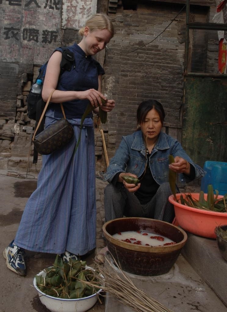 2006年5月31日,在山西省平遙縣街頭,一名外國游客在學習包粽子。