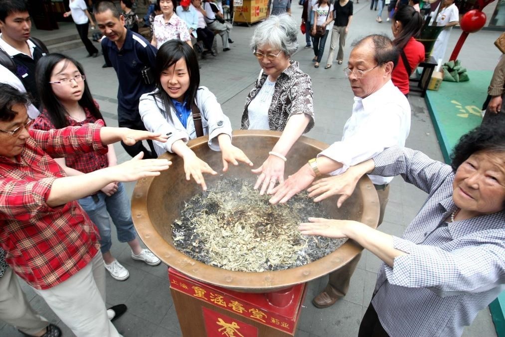 2009年5月26日,市民在上海豫園一家藥店門口體驗端午節(jié)的傳統(tǒng)民俗——白芷熏香。