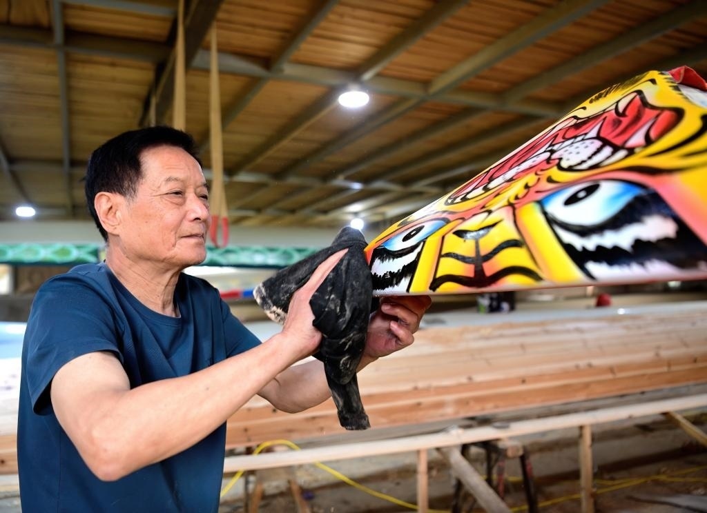 2024年6月3日,福州市非物質(zhì)文化遺產(chǎn)“方莊龍舟制造技藝(閩侯縣)”的傳承人方紹晃在擦拭準備交付的龍舟船頭。方莊村是福建遠近聞名的“龍舟村”,制造龍舟的技藝已傳承了700多年,每年有200余艘傳統(tǒng)龍舟銷往全國及海外。方紹晃介紹說,制作一艘福州傳統(tǒng)龍舟從原料選擇到制作都非常講究,主要選取閩北山區(qū)樹齡40年以上的杉木和樟木為原材料,歷經(jīng)做龍骨、釘?shù)装?、裝魚梁、拋光、畫花、上油漆等多道工序,最后裝上精心雕刻的龍頭才算大功告成。