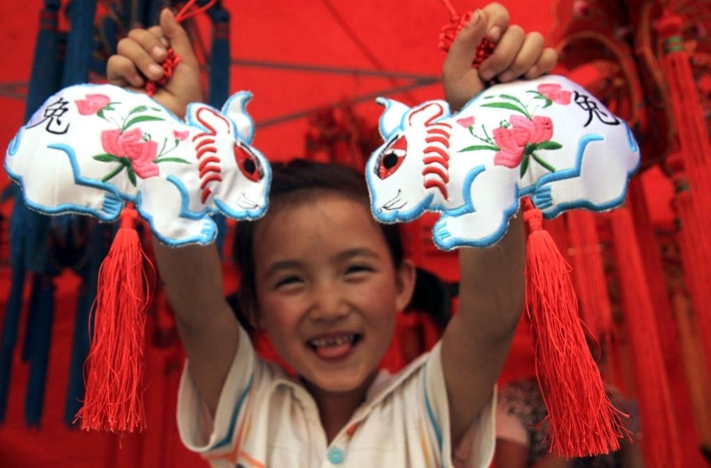 2011年6月5日,在有“香包之鄉(xiāng)”之稱的甘肅慶陽香包民俗文化節(jié)香包展棚里,一名小朋友展示玉兔香包。