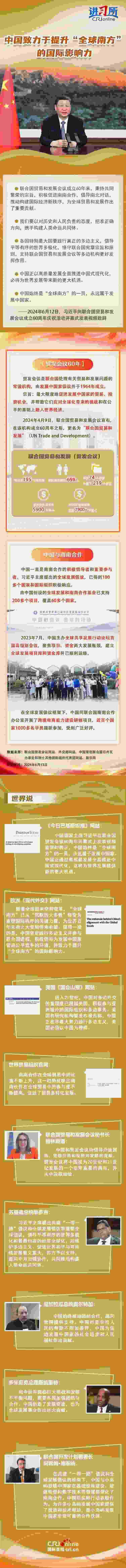 6月12日,中國國家主席習(xí)近平向聯(lián)合國貿(mào)易和發(fā)展會議成立60周年慶?;顒娱_幕式發(fā)表視頻致辭時強(qiáng)調(diào),中國正以高質(zhì)量發(fā)展全面推進(jìn)中國式現(xiàn)代化,必將為世界發(fā)展帶來新的更大機(jī)遇。