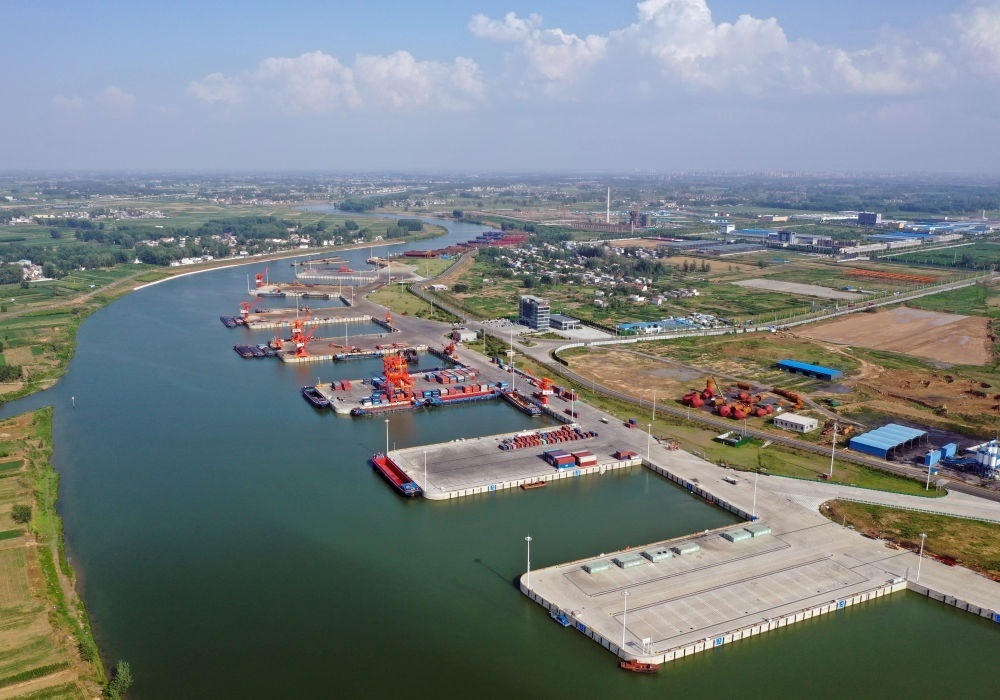 2022年6月28日拍攝的河南周口中心港碼頭(無人機照片)。近年來,河南積極推進沙潁河航道升級改造,疏通內(nèi)河航運?,F(xiàn)在,從周口中心港出發(fā)的船舶可經(jīng)沙潁河至淮河、京杭大運河駛?cè)腴L江,讓內(nèi)陸城市亦能通江達(dá)海。