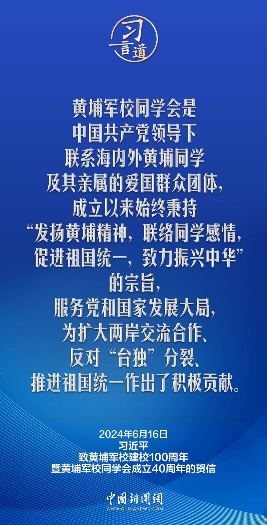 在黃埔軍校建校100周年暨黃埔軍校同學(xué)會成立40周年之際,中共中央總書記、國家主席、中央軍委主席習(xí)近平發(fā)來賀信,代表中共中央向黃埔軍校同學(xué)會表示熱烈祝賀,向廣大海內(nèi)外黃埔同學(xué)及其親屬致以誠摯問候。習(xí)近平指出——