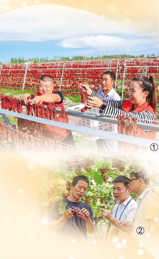 圖①:新疆維吾爾自治區(qū)博湖縣塔溫覺肯鄉(xiāng)辣椒曬場上,黨員志愿服務(wù)隊(duì)幫助村民晾曬辣椒。年 磊攝 圖②:浙江省淳安縣紀(jì)檢監(jiān)察干部走訪果農(nóng),聽取意見建議。謝航凱攝