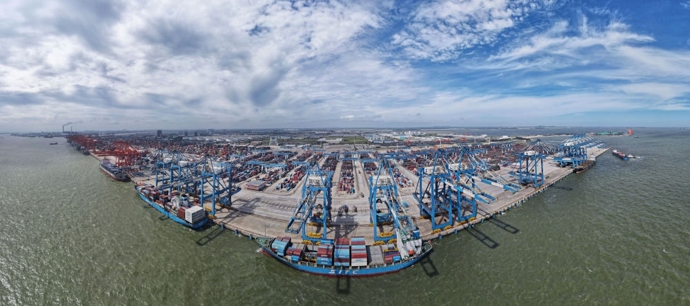 欽州港集裝箱裝卸自動化碼頭的集裝箱儲放地(2024年5月19日攝,無人機照片)。
