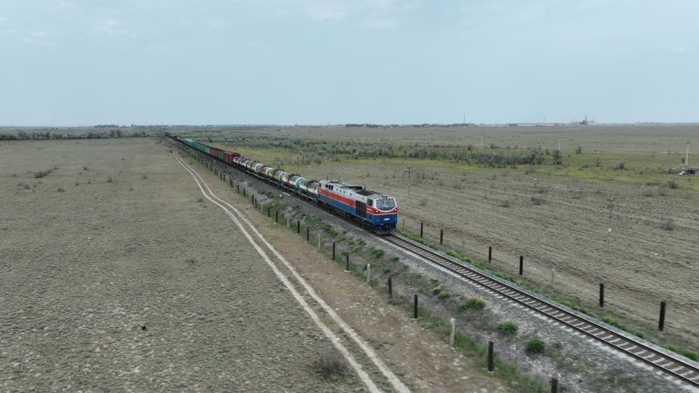 2023年5月12日,在哈薩克斯坦阿拉木圖附近,貨運(yùn)列車馳騁于阿拉木圖與霍爾果斯間(無人機(jī)照片)。新華社發(fā)(奧斯帕諾夫攝)