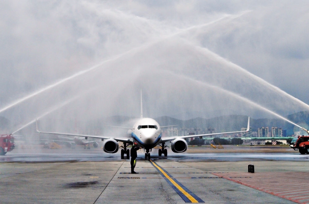 2008年,兩岸“三通”啟動(dòng)常態(tài)包機(jī),廈航成為廈門、福州和杭州航點(diǎn)的運(yùn)營航空公司。這是2008年12月15日,臺(tái)北松山機(jī)場以“水門”儀式迎接廈航常態(tài)化包機(jī)。