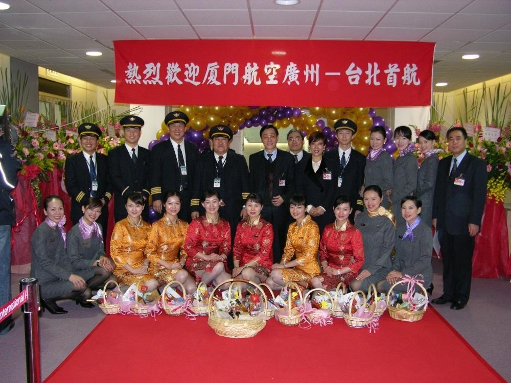 2005年,海峽兩岸首次開放春節(jié)包機(jī)。這是2005年1月29日,廈航作為大陸6家參與臺(tái)商春節(jié)包機(jī)直航的航空公司之一,圓滿完成了廣州-臺(tái)北往返包機(jī)任務(wù)。這是廈航首航臺(tái)北機(jī)組成員在臺(tái)北與迎接人員親切合影。