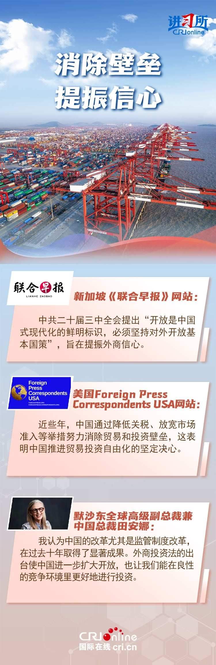 中共二十屆三中全會(huì)審議通過的《中共中央關(guān)于進(jìn)一步全面深化改革、推進(jìn)中國式現(xiàn)代化的決定》強(qiáng)調(diào),必須堅(jiān)持對(duì)外開放基本國策,堅(jiān)持以開放促改革,建設(shè)更高水平開放型經(jīng)濟(jì)新體制,并對(duì)完善高水平對(duì)外開放體制機(jī)制提出重要改革措施。