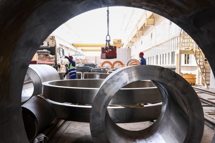 在蘭州蘭石集團高端裝備產(chǎn)業(yè)園,工人在生產(chǎn)車間作業(yè)(2024年7月25日攝)。新華社記者 呂帥 攝