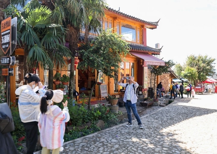 游客在云南麗江市玉龍納西族自治縣白沙鎮(zhèn)玉湖村拍照留念(2024年7月31日攝)。新華社記者 呂帥 攝