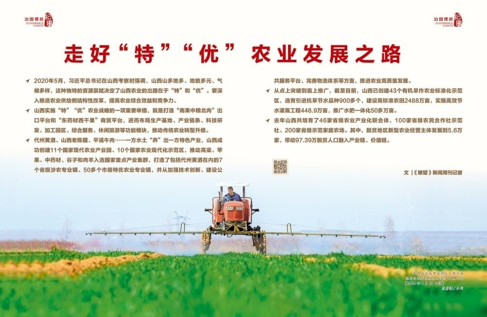 ◇2020年5月,習(xí)近平總書記在山西考察時(shí)強(qiáng)調(diào),山西山多地多、地貌多元、氣候多樣,這種獨(dú)特的資源稟賦決定了山西農(nóng)業(yè)的出路在于“特”和“優(yōu)”。要深入推進(jìn)農(nóng)業(yè)供給側(cè)結(jié)構(gòu)性改革,提高農(nóng)業(yè)綜合效益和競(jìng)爭(zhēng)力。