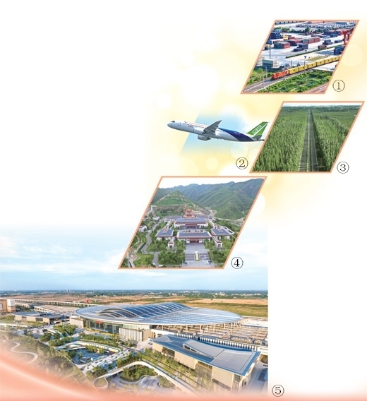 圖①:中歐班列從國鐵集團鄭州局圃田車站駛出。國 徽攝(影像中國)圖②:國產(chǎn)大型客機C919。鄧智煒攝(新華社發(fā))圖③:新疆溫宿縣柯柯牙的“三北”防護林。新華社記者 李 響攝圖④:中國國家版本館中央總館。本報記者 陳 斌攝圖⑤:雄安站。宋 宇攝(影像中國)