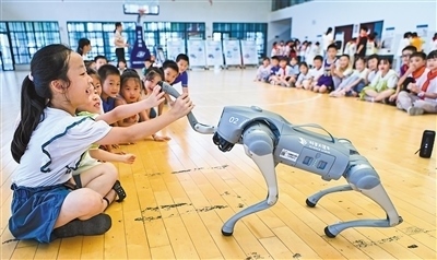 安徽省安慶市科普大篷車巡展活動(dòng)走進(jìn)岳西縣菖蒲鎮(zhèn)中心學(xué)校。圖為學(xué)生與機(jī)器狗互動(dòng)。王先國攝(影像中國)