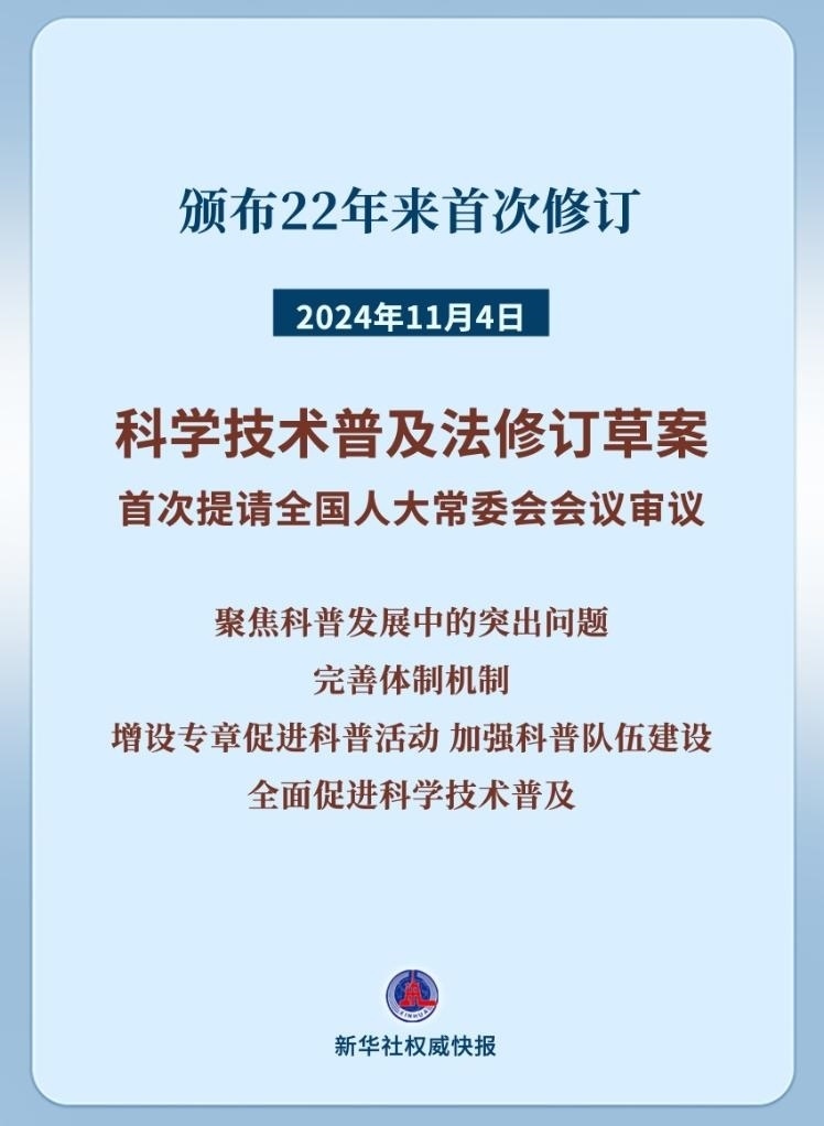 科學(xué)技術(shù)普及是實(shí)現(xiàn)創(chuàng)新發(fā)展的重要基礎(chǔ)性工作。11月4日,科學(xué)技術(shù)普及法修訂草案首次提請全國人大常委會(huì)會(huì)議審議,這是科學(xué)技術(shù)普及法自2002年公布施行以來首次修訂。