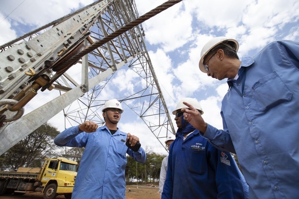 2018年8月7日,在巴西東南部米納斯吉拉斯州阿科斯市附近,巴西美麗山特高壓輸電工程二期第九標段項目中方現(xiàn)場施工管理負責人(左)在施工現(xiàn)場指導巴方員工。美麗山水電站二期項目是中國國家電網(wǎng)公司首個在海外獨立投資、建設(shè)和運營的特高壓直流輸電工程,也是“特高壓+清潔能源”在拉美的示范工程。