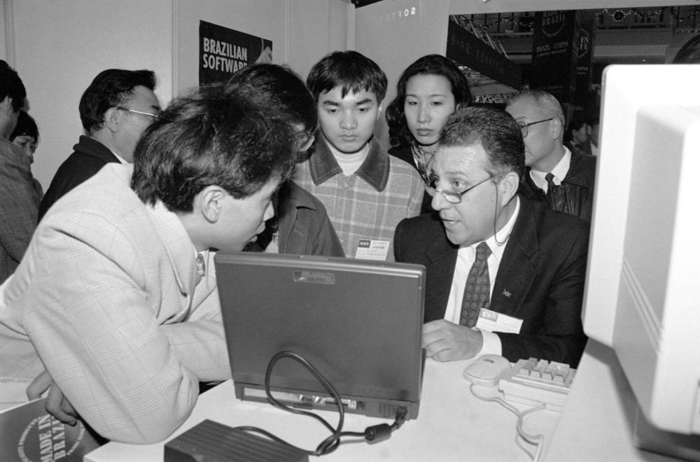 1995年12月14日,巴西外貿(mào)及合資項目洽談會在上海舉行。這是一位參展商向參觀者介紹巴西電腦網(wǎng)絡系統(tǒng)軟件設(shè)備。