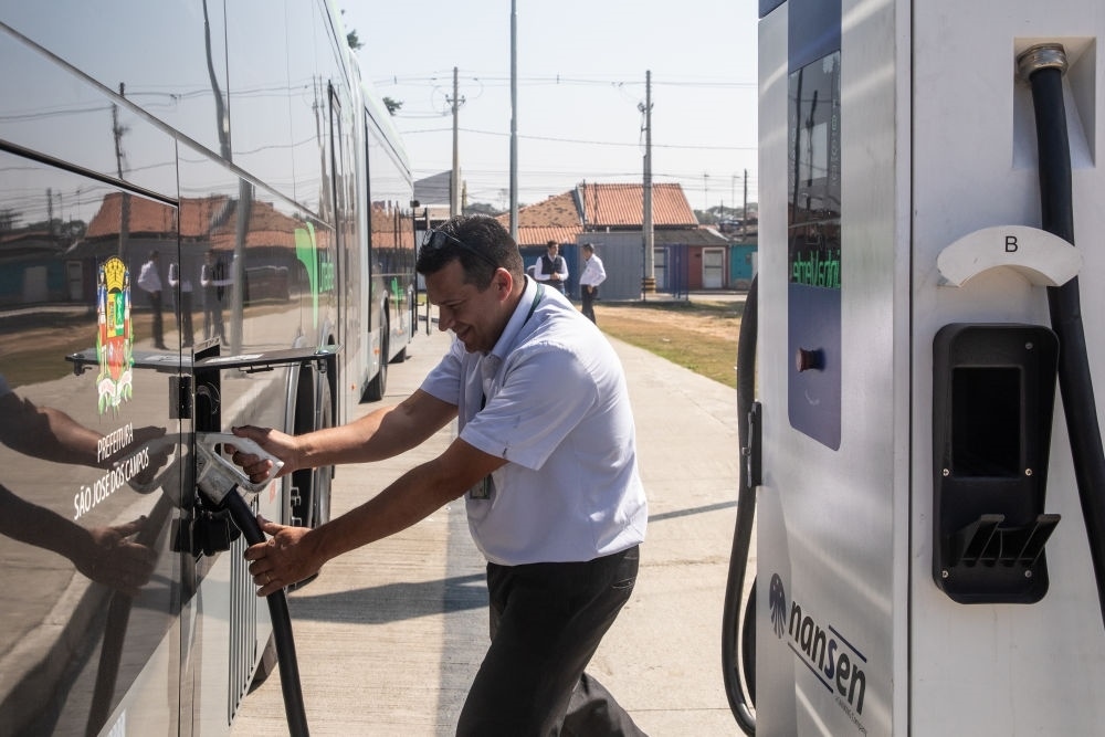 2021年11月,12臺中國制造的純電動鉸鏈式大巴在巴西航天城——圣若澤杜斯坎普斯純電快速公交系統(tǒng)投用。這是2023年7月12日,工作人員為中國制造的純電動大巴充電。