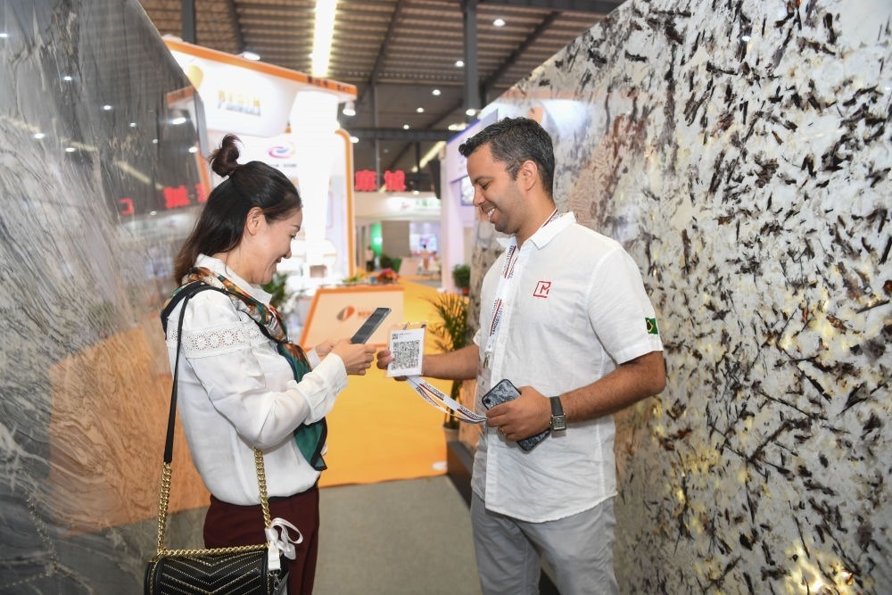 2019年11月8日,巴西商人馬庫斯在福建省南安市水頭鎮(zhèn)舉辦的國際石材博覽會上向國內(nèi)客商出示自己的微信二維碼。