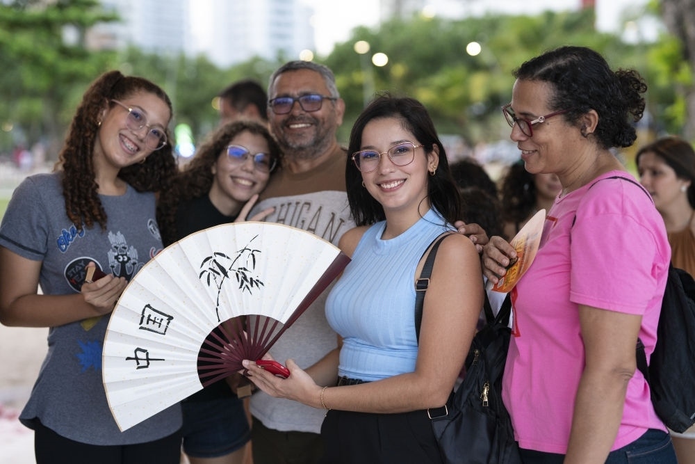 2024年2月3日,一名女子在巴西累西腓舉行的中國春節(jié)慶?;顒由险故咀约簳鴮懙纳让妗?/p>