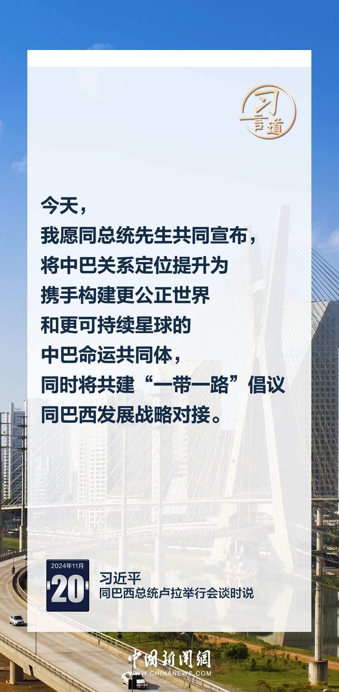 當(dāng)?shù)貢r間11月20日,中國國家主席習(xí)近平在巴西利亞總統(tǒng)官邸同巴西總統(tǒng)盧拉舉行會談。習(xí)近平指出——