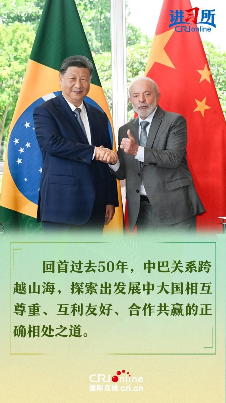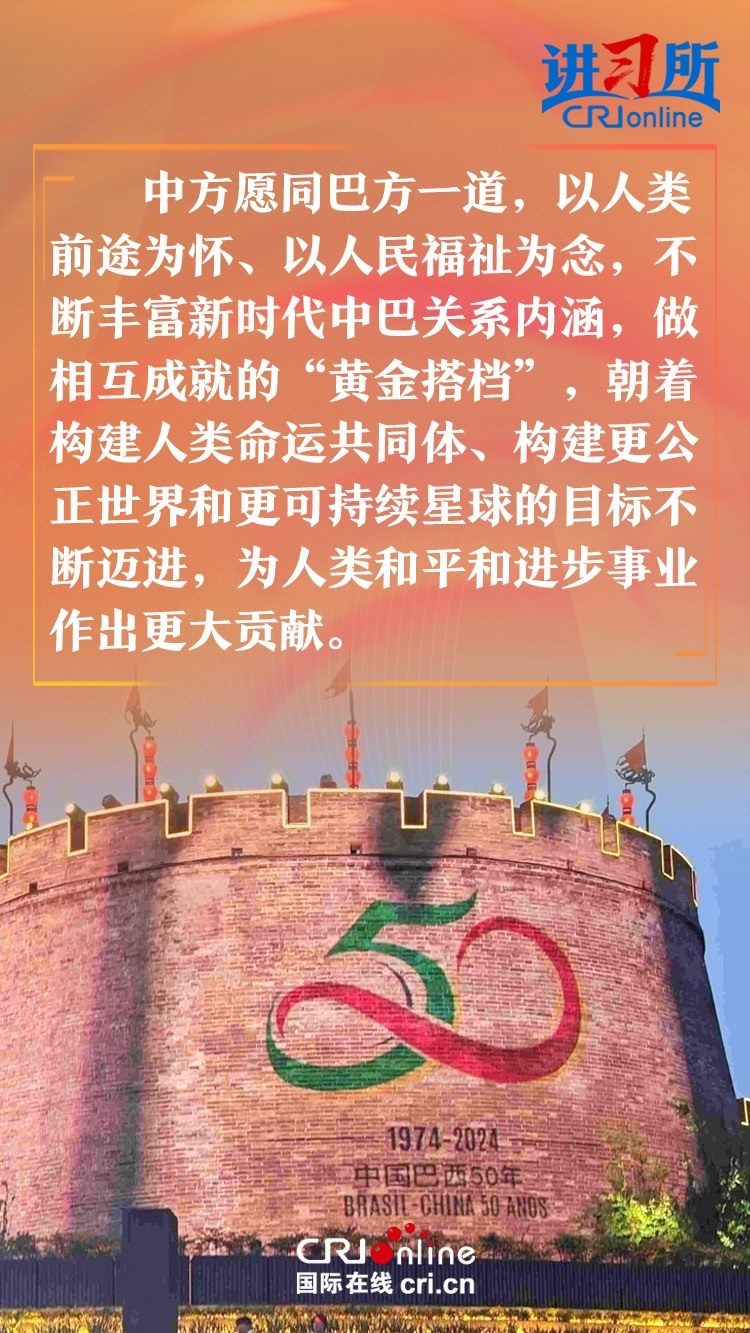 今年是中巴建交50周年。習近平指出,回首過去50年,中巴關系跨越山海,探索出發(fā)展中大國相互尊重、互利友好、合作共贏的正確相處之道。中方愿同巴方一道,以人類前途為懷、以人民福祉為念,不斷豐富新時代中巴關系內涵,做相互成就的“黃金搭檔”,朝著構建人類命運共同體、構建更公正世界和更可持續(xù)星球的目標不斷邁進,為人類和平和進步事業(yè)作出更大貢獻。