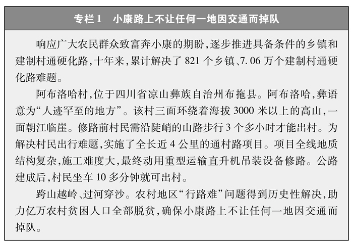 通達(dá)深度全面提升。實(shí)現(xiàn)了具備條件的約3萬個鄉(xiāng)鎮(zhèn)、超過50萬個建制村全部通硬化路(專欄1)。有序?qū)嵤┝溯^大人口規(guī)模自然村(組)通硬化路建設(shè)。旅游景點(diǎn)、產(chǎn)業(yè)園區(qū)、資源礦產(chǎn)等農(nóng)村地區(qū)主要經(jīng)濟(jì)節(jié)點(diǎn)的通硬化路問題基本解決。偏遠(yuǎn)地區(qū)尤其是山區(qū)農(nóng)民群眾對外出行更加便捷。