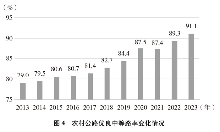 技術(shù)等級逐年提高。截至2023年底,農(nóng)村公路等級路②里程及比例分別達(dá)到445萬公里和96.8%,鋪裝路面里程及比例分別達(dá)到422萬公里和91.8%,十年間分別提高了11.9個百分點(diǎn)、27.2個百分點(diǎn)。