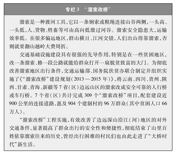 解決特殊地區(qū)出行難題。改一條溜索、修一段公路就能給群眾打開一扇脫貧致富的大門。為了保障偏遠(yuǎn)山區(qū)百姓安全出行,推動“溜索改橋”建設(shè),專項(xiàng)資金支持、精心組織實(shí)施,用3年時間徹底改善了溜索地區(qū)出行條件(專欄3)。推進(jìn)“直過民族”③和人口較少民族聚居區(qū)農(nóng)村公路建設(shè),解決民族地區(qū)交通閉塞的突出問題,加快民族地區(qū)脫貧致富步伐。