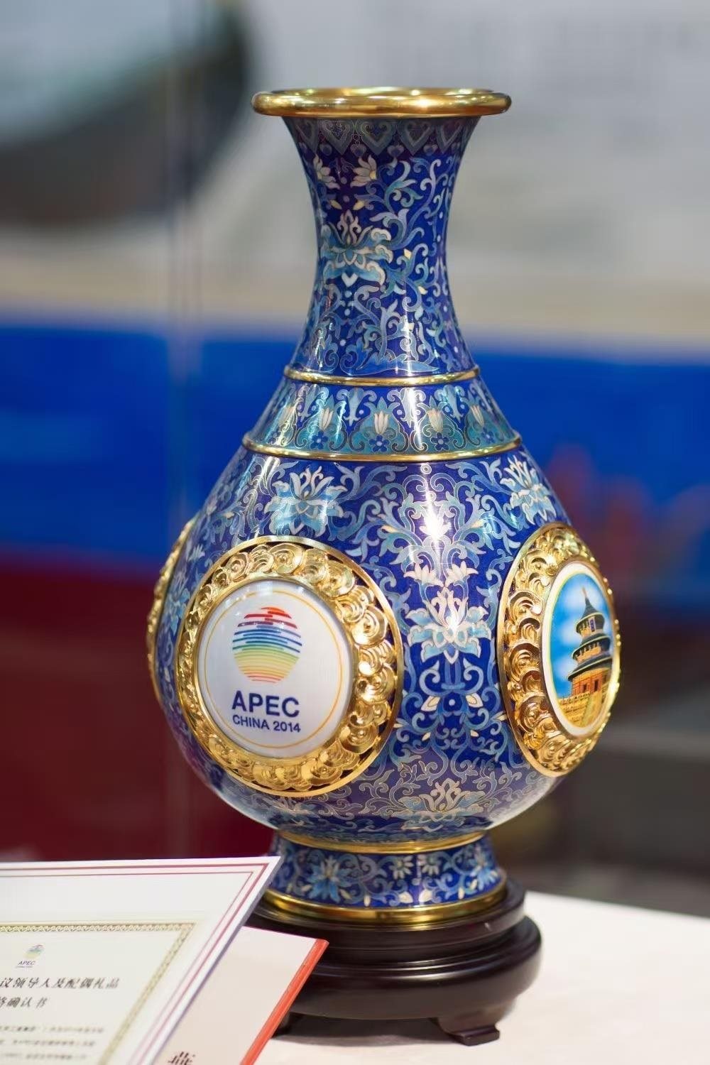 2014年11月,北京APEC會(huì)議在雁棲湖畔舉行。為歡迎參會(huì)的各經(jīng)濟(jì)體領(lǐng)導(dǎo)人,習(xí)近平主席選定了一件國(guó)禮——“四海升平”景泰藍(lán)賞瓶。賞瓶的細(xì)節(jié)蘊(yùn)含巧思:瓶高38厘米,是天壇祈年殿38米的等比例縮小;最大直徑21厘米,代表APEC的21個(gè)經(jīng)濟(jì)體。碧藍(lán)的瓶身雕著水紋,既象征“四海”也代表環(huán)太平洋。“瓶”是“平”的諧音,連起來即“四海升平”。