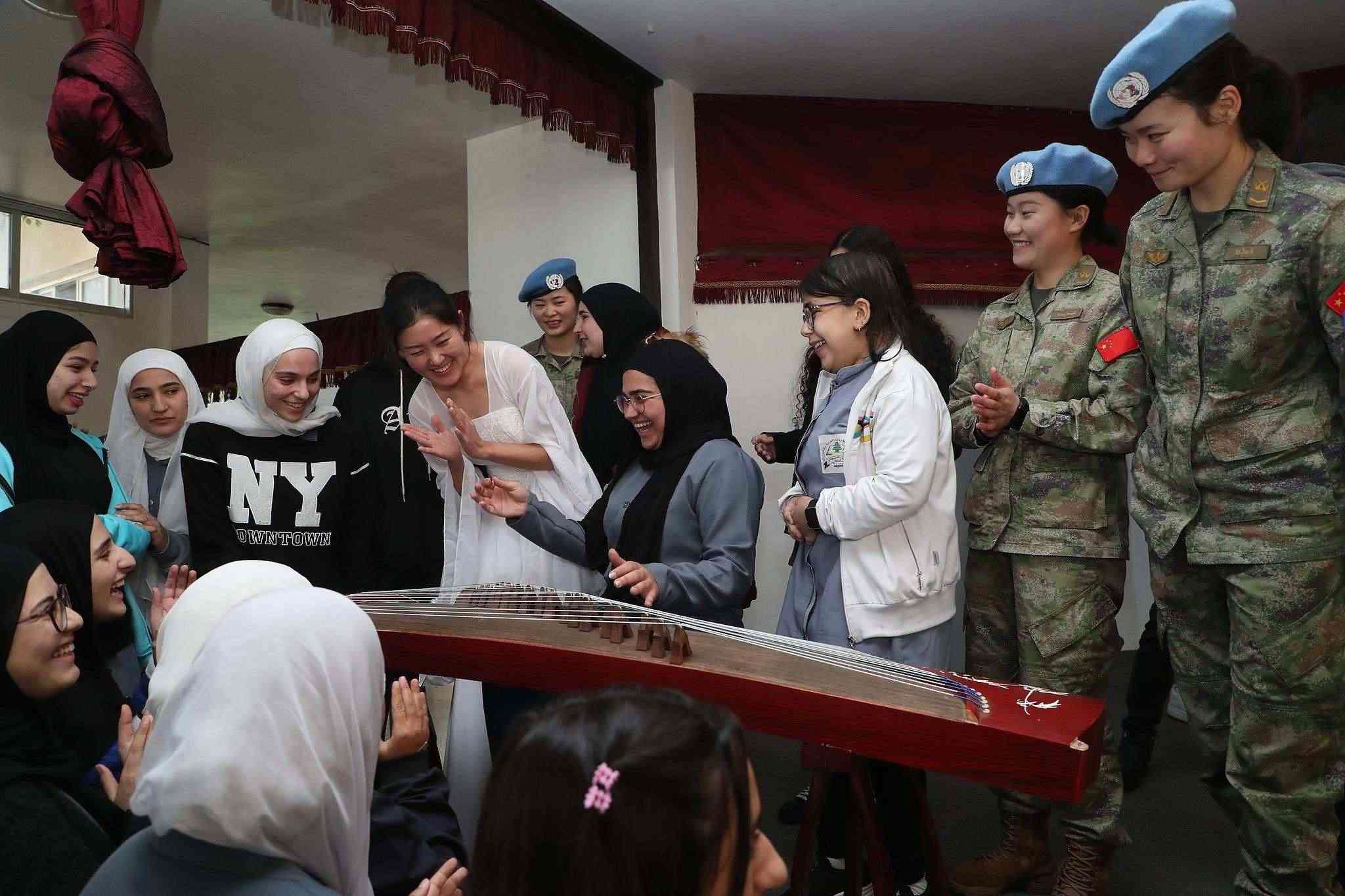 △2024年3月12日,中國(guó)第22批赴黎維和部隊(duì)官兵與黎巴嫩庫雷拉中學(xué)開展文化交流活動(dòng)。